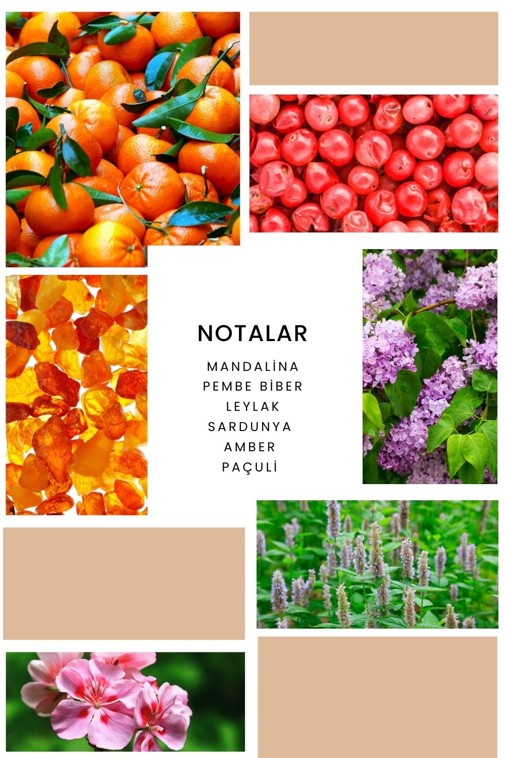 Notalar: Mandalina, pembe biber, leylak, sardunya, amber, paçuli