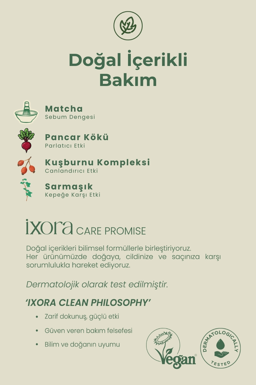 İxora Dökülme Karşıtı Matchalı Şampuan, içeriğinde bulunan vitamin kompleksleri ve özel üretilen bitki ekstratları sayesinde, saçlarınızın güçlenmesine ,saç dökülmesini önlemeye, saçlarınızda biriken kirleri ve saç ürünlerinin kalıntılarını arındırmaya yardımcı olur. Ayrıca günlük düzenli kullanım sonrasında; özenle geliştirilen bu özel formül ve yapıda bulunan yüksek antioksidan içeriğiyle bilinen Matcha bitkisi desteğiyle, saç ve saç deriniz için doğal bir arınma ve yenilenme kaynağı olup, saç köklerinizi çevresel faktörlere karşı korurken, sebum dengesini düzenleyerek saçınızın gün boyu ferah ve temiz kalmasına yardımcı olur.