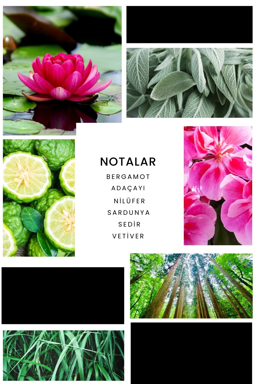 Notalar: Bergamot, adaçayı, nilüfer, sardunya, sedir ve vetiver