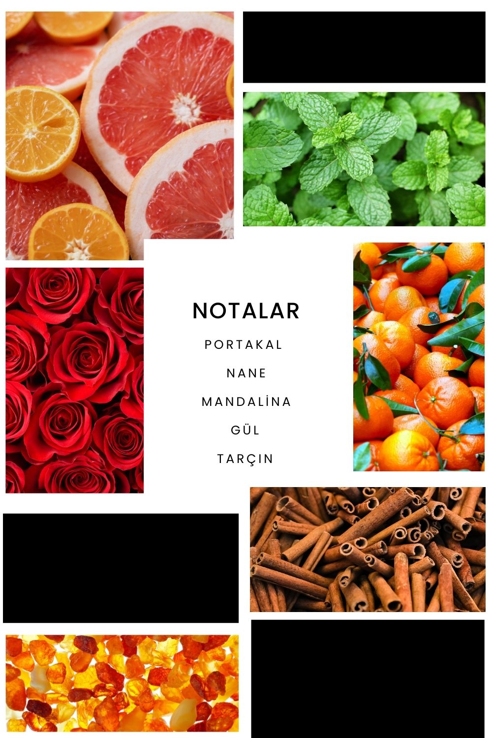 Notalar: Greyfurt, nane, mandalina, gül, tarçın, baharatlı deri, odunsu notalar, silhat esansı ve amber