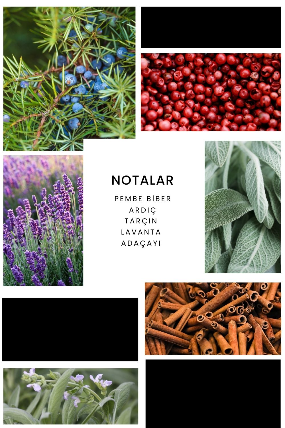 Notalar: Pembe biber, ardıç, tarçın, lavanta ve adaçayı